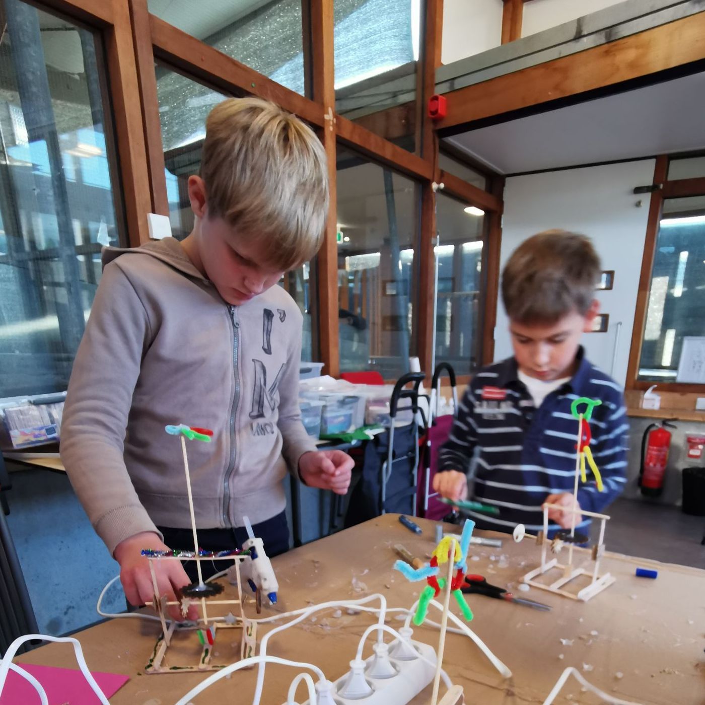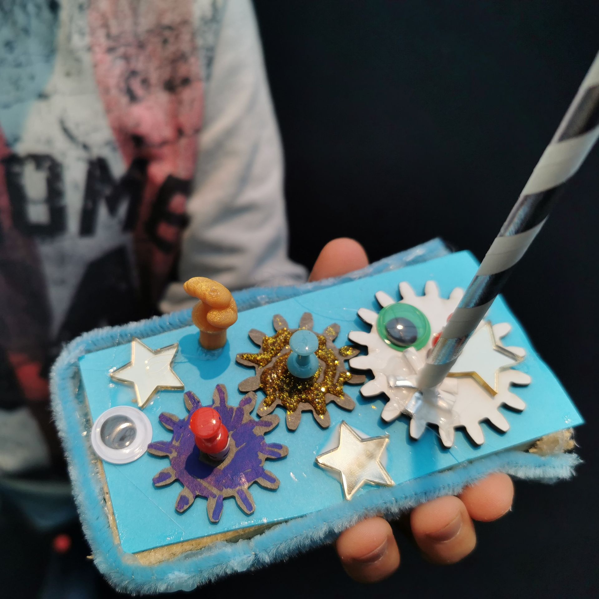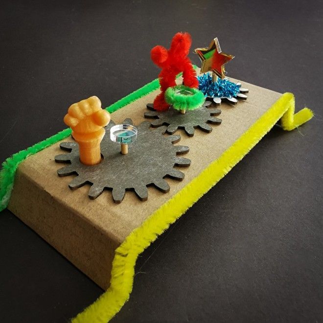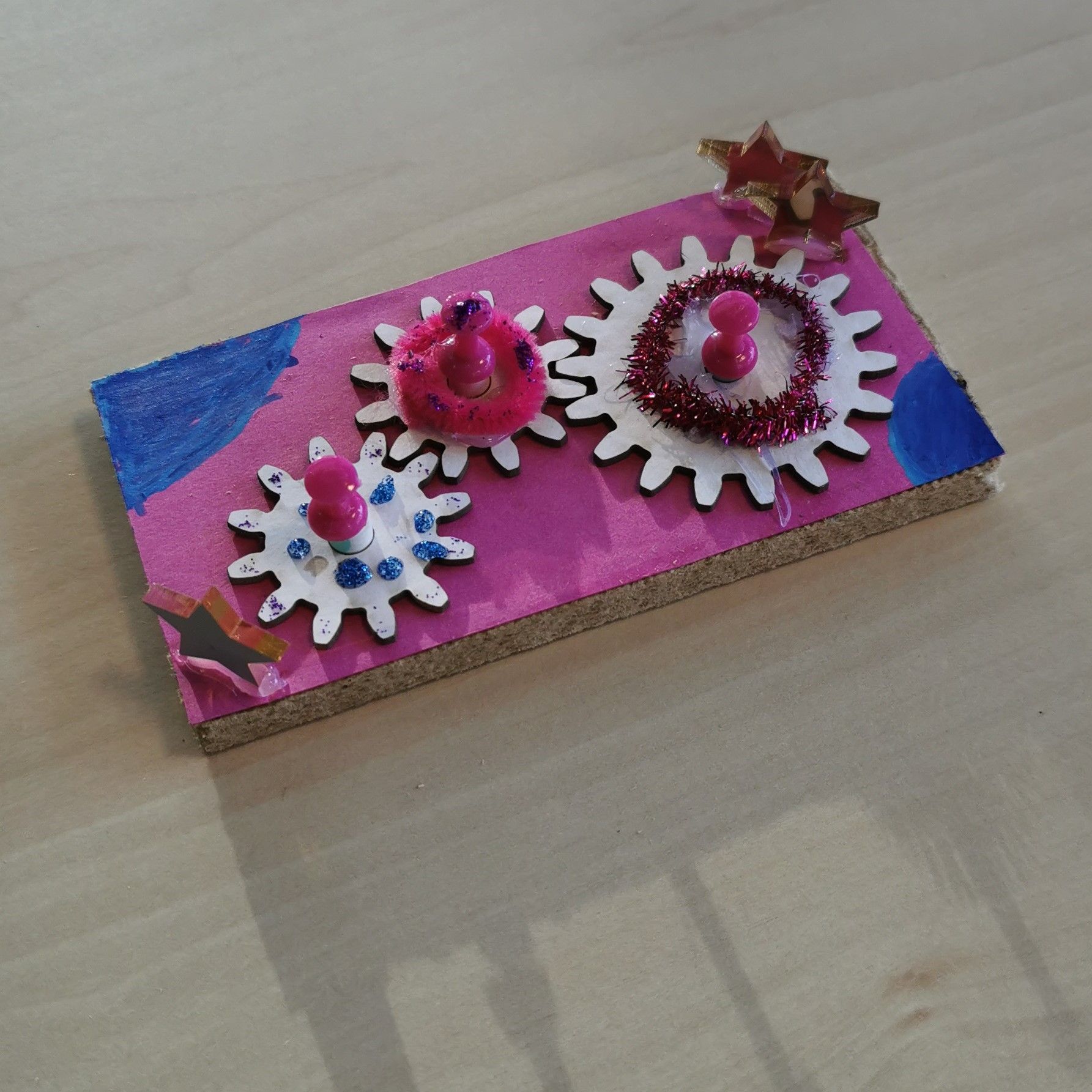 Leer hoe je een beweging kan overzetten met tandwielen. Hoe werken tandwielen en kun je er ook iets leuks mee doen? Eindresultaat: een vrolijk draaimechanisme.